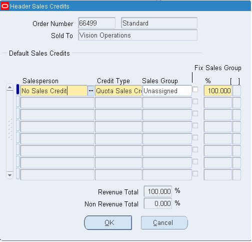 Errors In case you have message text as ‘Order-level sales credit total () must equal 100%.’ and not able to book the order then follow below process. Order Information tab (Header) >> Click on Actions >> Sales Credits >> Enter the Salesperson details >> Give % as 100 >> Ok >> Save