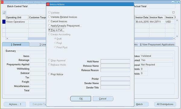 Navigation: AP % Interface Administration >> Requests >> Run >> ‘Payables Approval’ with Option All and Invoice Batch Name as given above. If there is any mismatch between billed (invoice) and received quantity then holds will be applied here. These holds will be released by ‘% Payables Supervisor’ responsibility. Open Invoice and click Release..1. Enter release name and release reason to release holds. After releasing all holds run approval process again and check the status should be Validated.