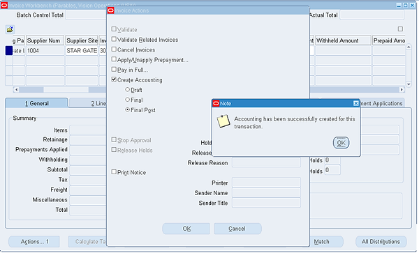 Now again click on Actions…1 >> Select Create Accounting with Final Post. This send the Accounting entries to GL & Post