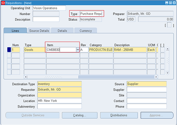 Purchasing, Vision Operations (USA) responsibility >> Requisitions >> Requisitions >> Header Level >> Line level (item details) >> Distribution level (account details)