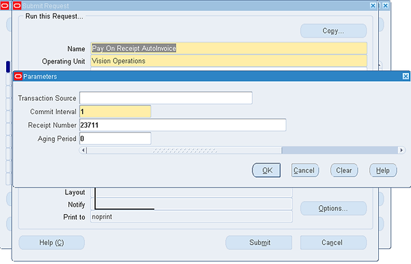 Purchasing, Vision Operations (USA) responsibility >> View >> Requests >> Run ‘Pay On Receipt AutoInvoice’ >> Enter Receipt Number
