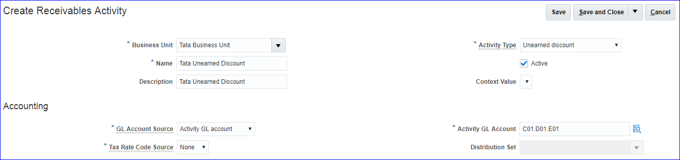 In implementation project search for task ‘Manage Reference Data Sets’ (Path – Financial) >> Create >> Set code: TATA_RDS_CUST_SITE; Set Name: Tata Reference Data Set Customer Site >> Save and Close