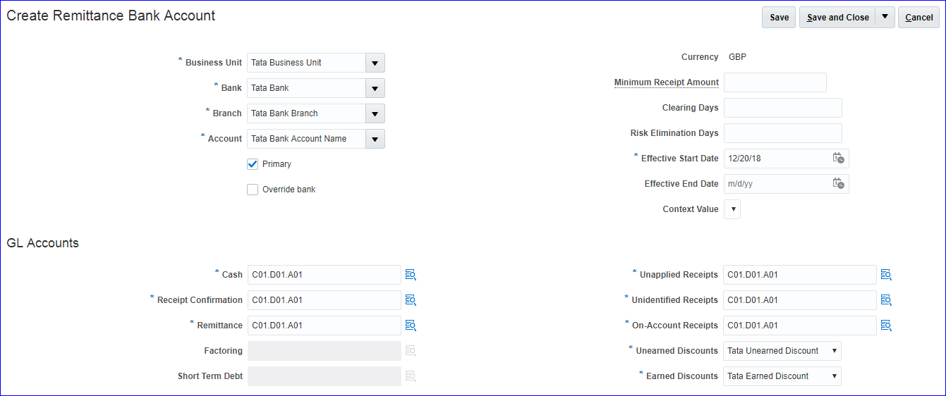 In implementation project search for task ‘Manage Receivables Customer Profile Classes’ >> Create >> Profile Class: Tata Profile Class; Collector: Srikanth Collector; Payment Terms: Tata Pay Terms; Statement Cycle: Tata Statement >> Save and Close