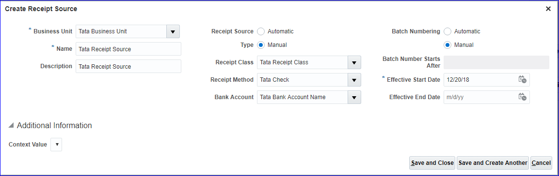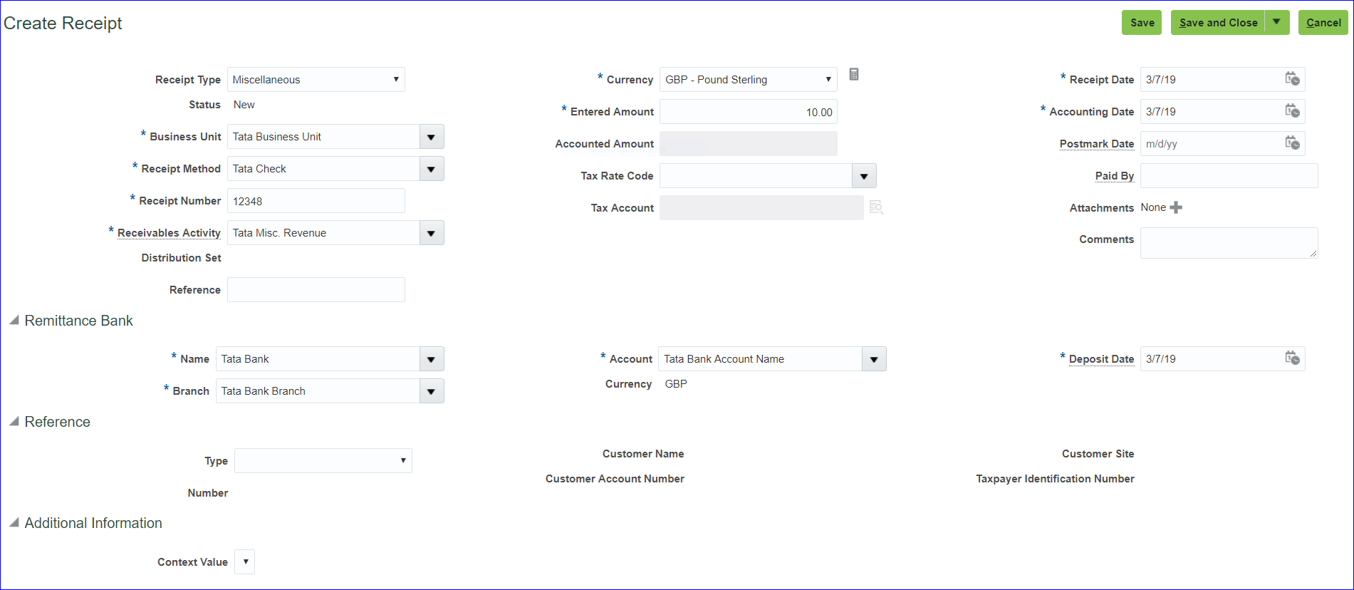 Name: Tata Receipt Class; Creation Method: Manual; Remittance Method: Standard; Clearance Method: By Matching