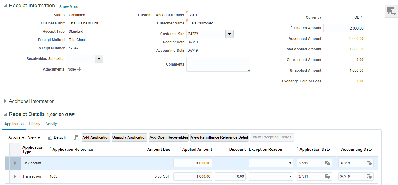 Receivable >> Accounts Receivable >> Tasks >> Manage Receipts >> Search receipt number (12347) >> Select line & Edit >> Select On Account line and click on Unapply Application >> Save and Close >> Add Open Receivables >> Search your customer and select any line which you want to apply >>Add >> Done >> Save and Close
