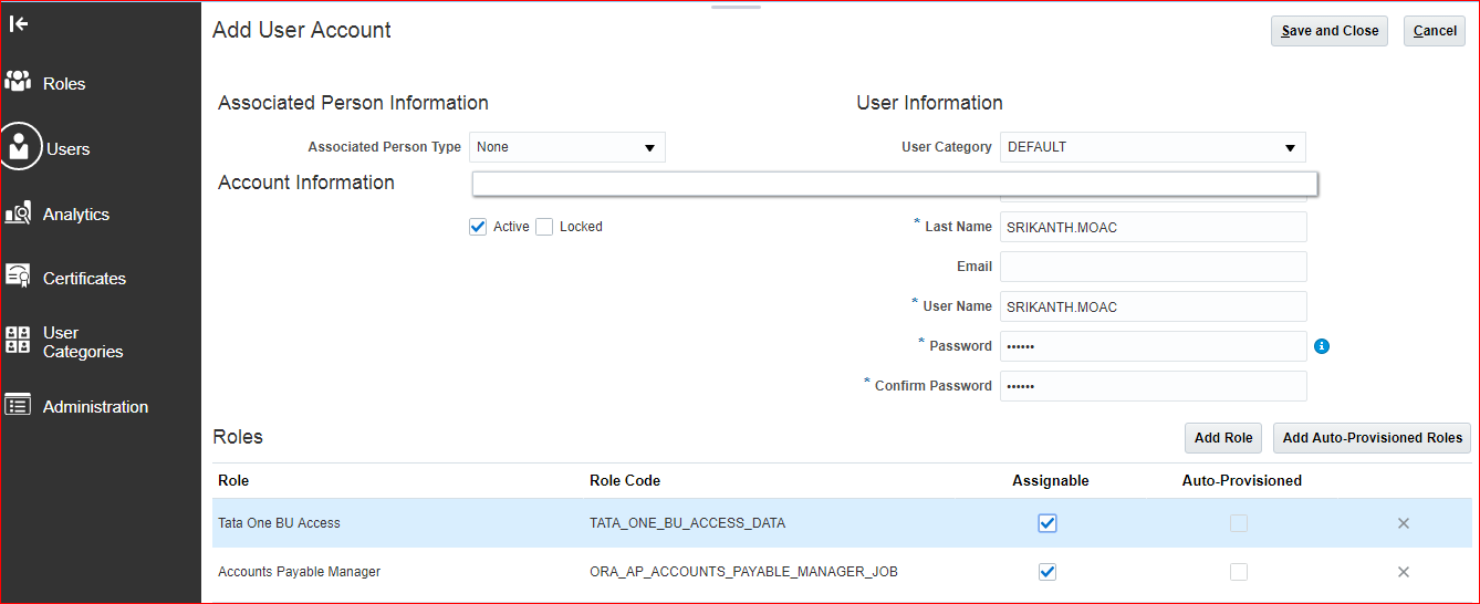 Navigation: Login to application using user (SCM_IMPL) which will be provided by vendor >> Navigator >> Tools >> ‘Security Console’ task >> Users >> Add User Account >> Enter mandatory fields >> Click on ‘Add Role’>> Search for below three roles and add them by clicking on ‘Add Role Membership’