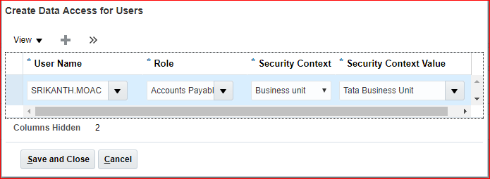 Navigator >> Tools >> Security console >> Create Role >>Role Name: TCS AP Manager Job Role; Role Code: TCS_AP_MANAGER_JOB_ROLE; Role Category: Financials – Job Roles >> Next >> Add Function Security Policy >> ‘Payables Invoice Creation’ duty role and ‘Payables Payment Creation’ duty role >> Next >> Create Data Security Policy >> Policy Name: BU Access; Database Resource: Business Unit; Data Set: Select by Instance set; Condition Name: Access the business units…for which they are authorized; Actions: Manage Payables Invoice >> Ok >> Next >> Next >> Add your user >> Save and Close
