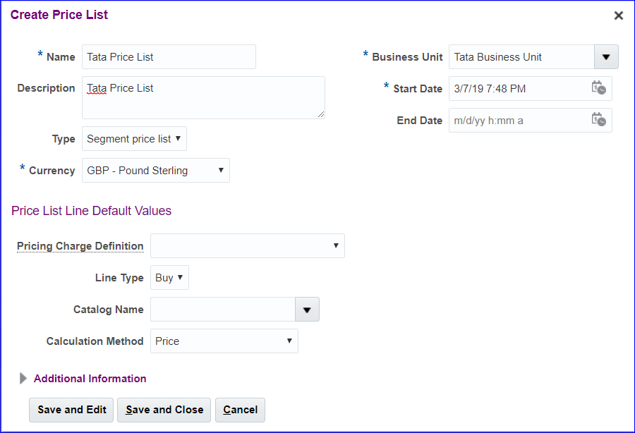 Pricing Administration >> Tasks >> Manage Price Lists >> Create