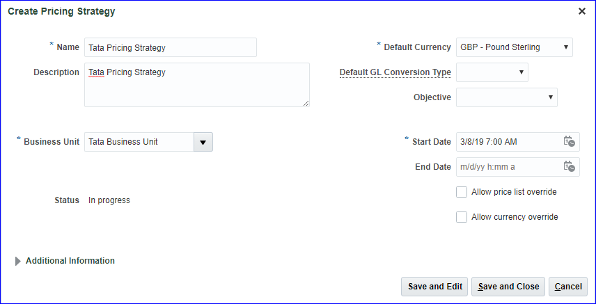 Pricing Administration >> Tasks >> Manage Pricing Strategies >> Create