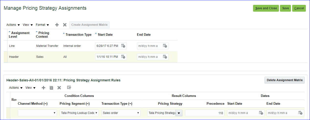 Pricing Administration >> Tasks >> Manage Pricing Strategy Assignments >> Create >> Select Header line >> Click on Add row at Assignment level (Header-Sales-All-01/01/2016 22:11: Pricing Strategy Assignment Rules)