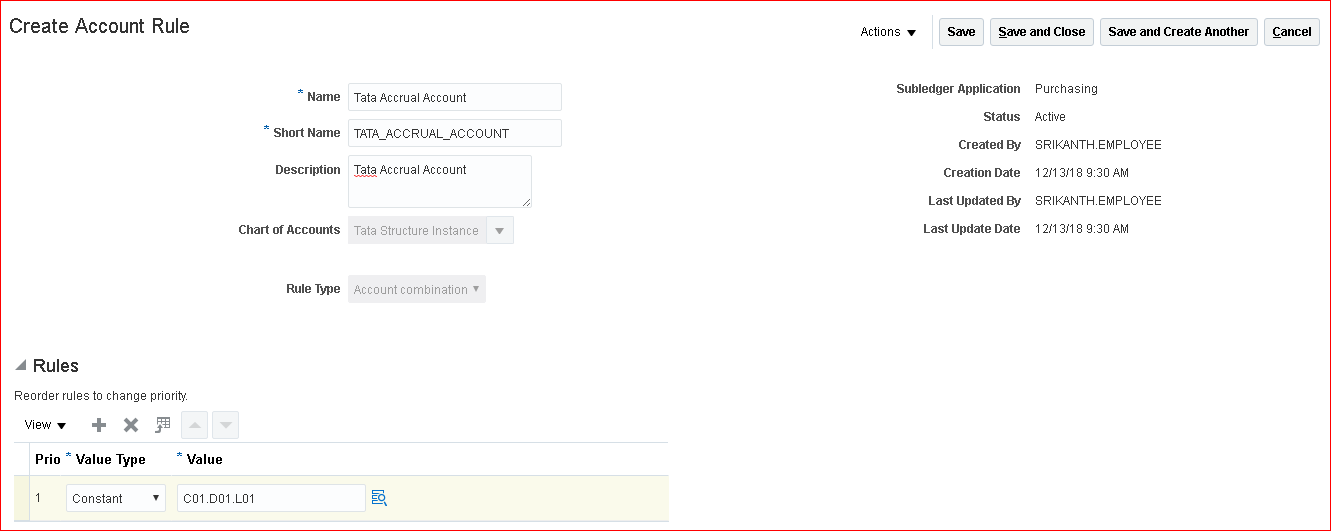 Task ‘Manage Subledger Accounting Options’ >> Path: Procurement > Define Common Procurement Configuration > Define Transaction Accounting for Procurement > Define Transaction Account Rules >> Search ‘Tata Primary Ledger’ >> Purchasing (In case we do not see Purchasing then edit any component and close)>> Edit accounting options >> Transaction Account Definition: Tata PO TAB >> Save and Close