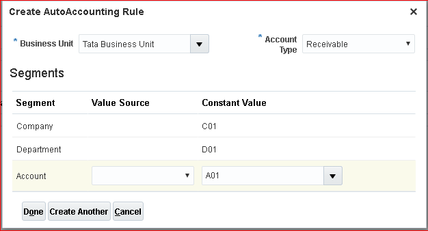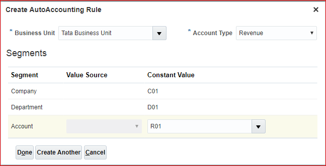 4. Autoaccounting Configuration Implementation project >> Task 'Manage AutoAccounting Rules' >> Create