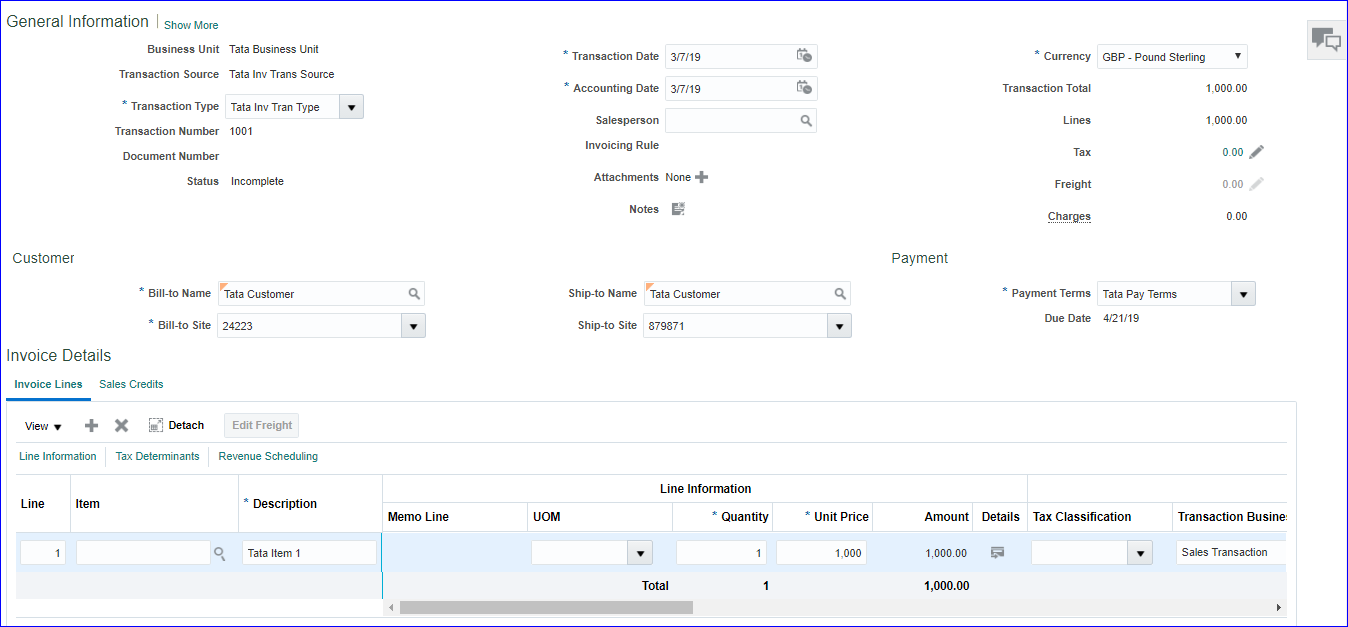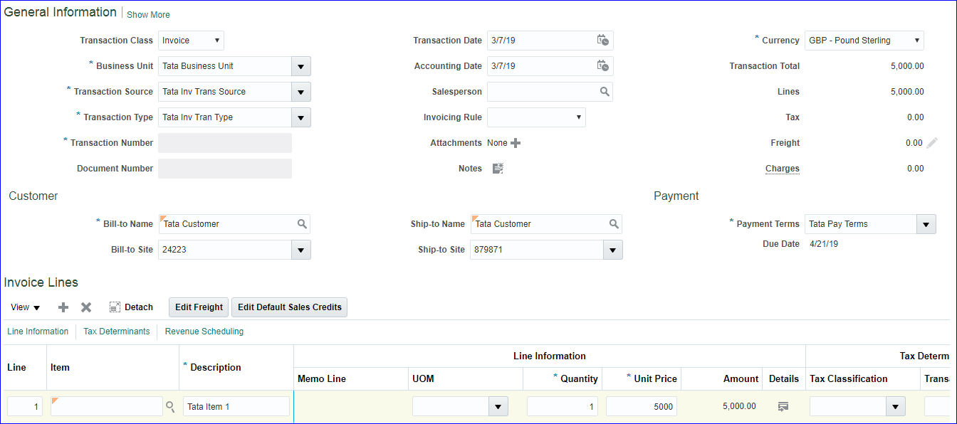 21. Create Transaction Navigator >> Receivables >> Billing >> Tasks >> Create Transaction