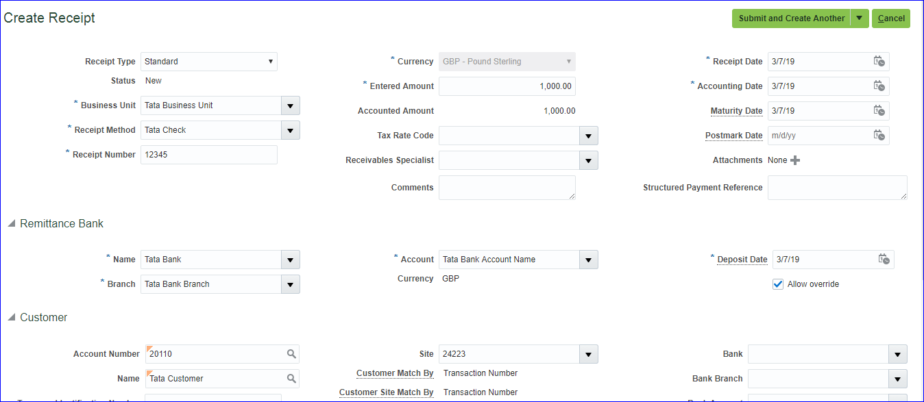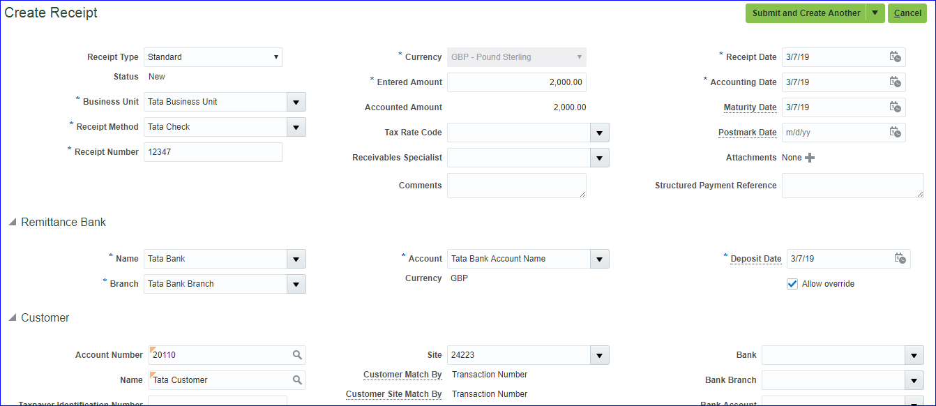 28. Creation of On Account receipt Receivable >> Accounts Receivable >> Tasks >> Create Receipt