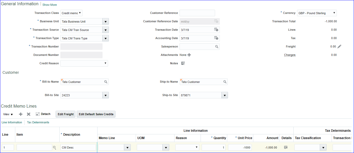 Credit memo(Name: Tata CM Trans Type; Creation Sign: Negative Sign)