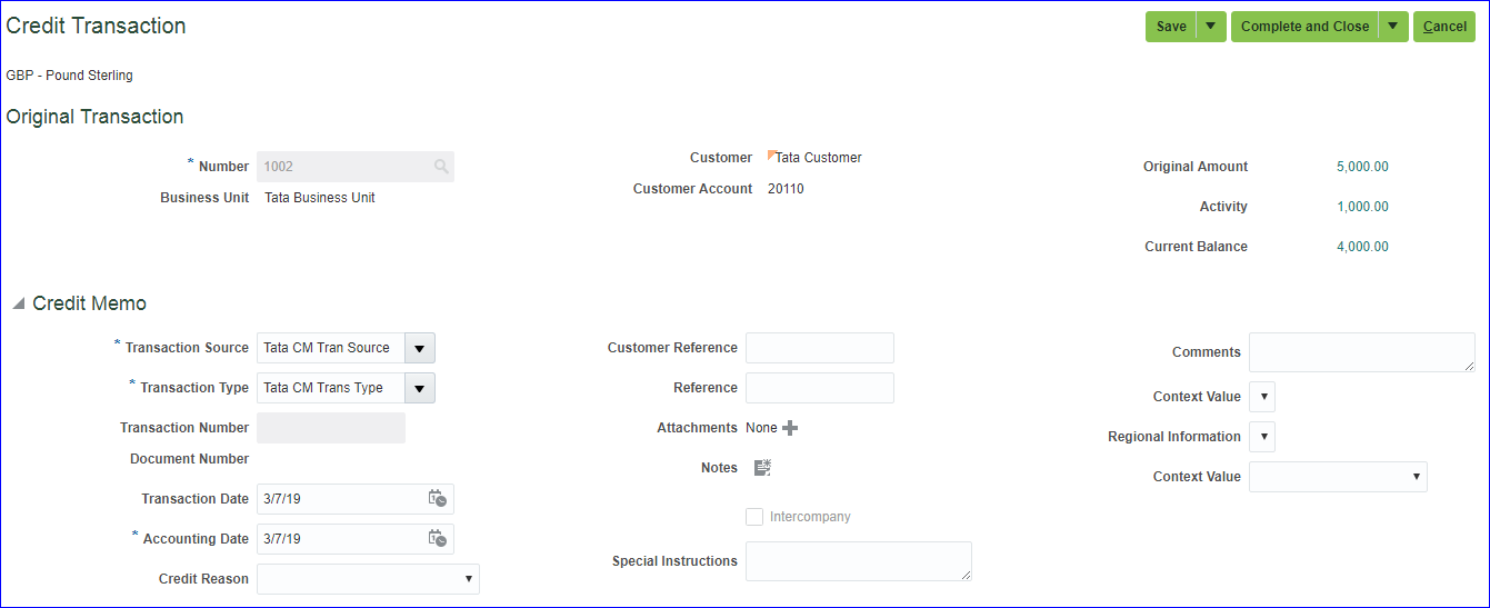 Complete and Review. New credit memo created with transaction number as 2 >> Save and Close.