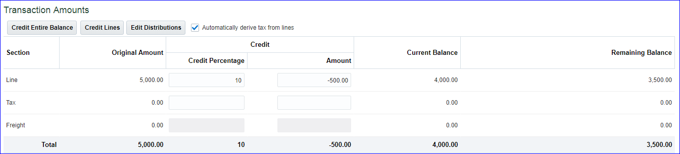 24. Create Automatic Credit Memo Receivable >> Billing >> Tasks >> Credit Transaction >> Search Original Transaction number (1002 - Here we are using above transaction number itself. Our previous manual CM of -1000 has been debited and current balance is 4000. Now we will apply CM of -500)