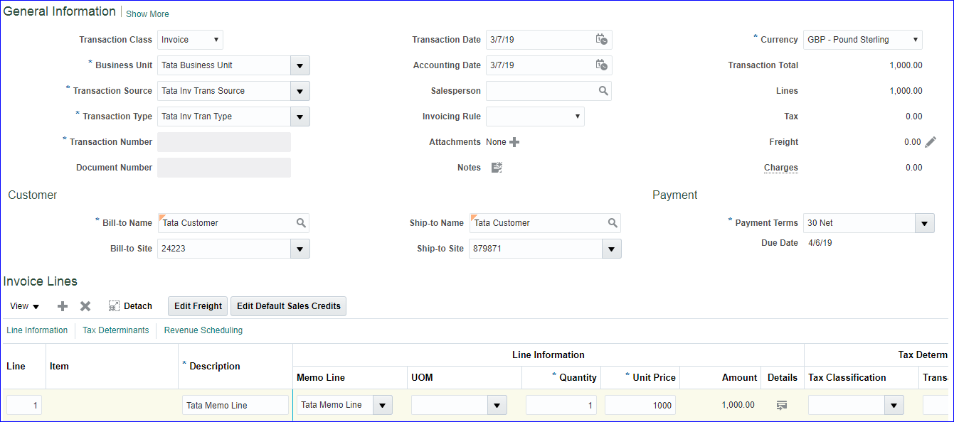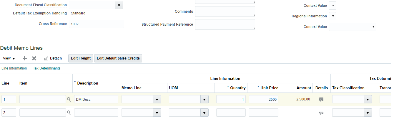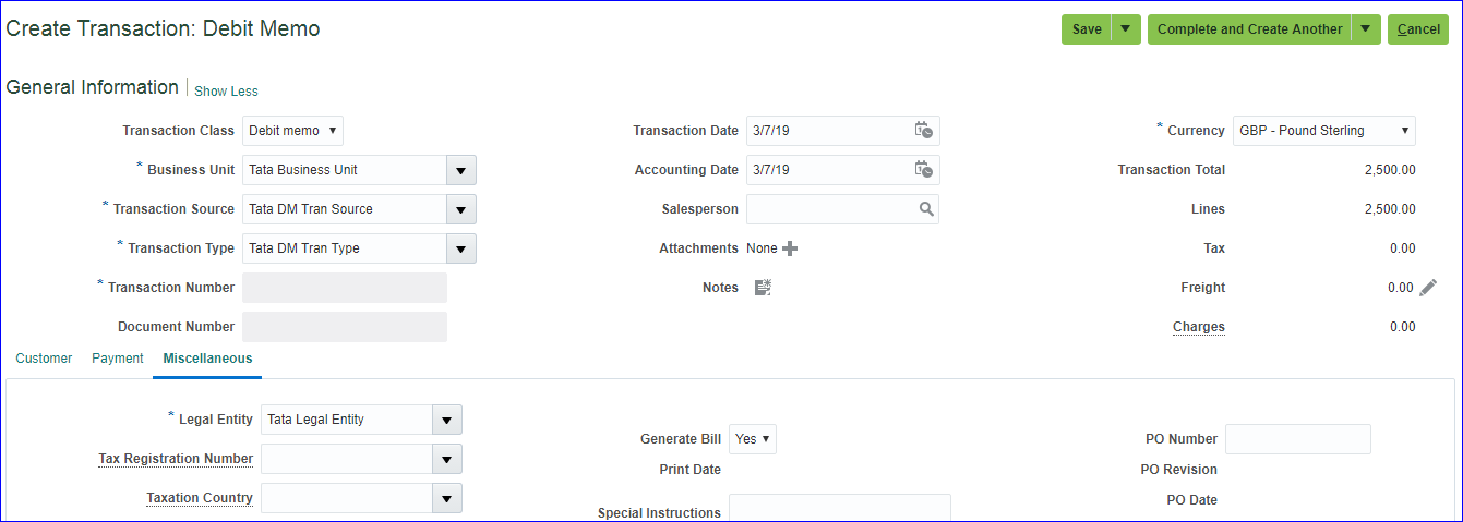 25. Creation of Debit Memo We will make use of invoice transaction 1002 with current balance of 3500. Billing >> Tasks >> Create Transaction >> Show More >> Under Customer tab enter customer details; Payment tab - select your payment terms; Miscellaneous tab enter invoice transaction number at Cross Reference.