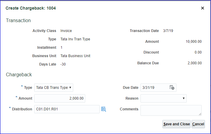 Change Due Date (I gave 31-Mar-2019) >> Save and Close >> The chargeback 100001 has been created. >> Save and Close