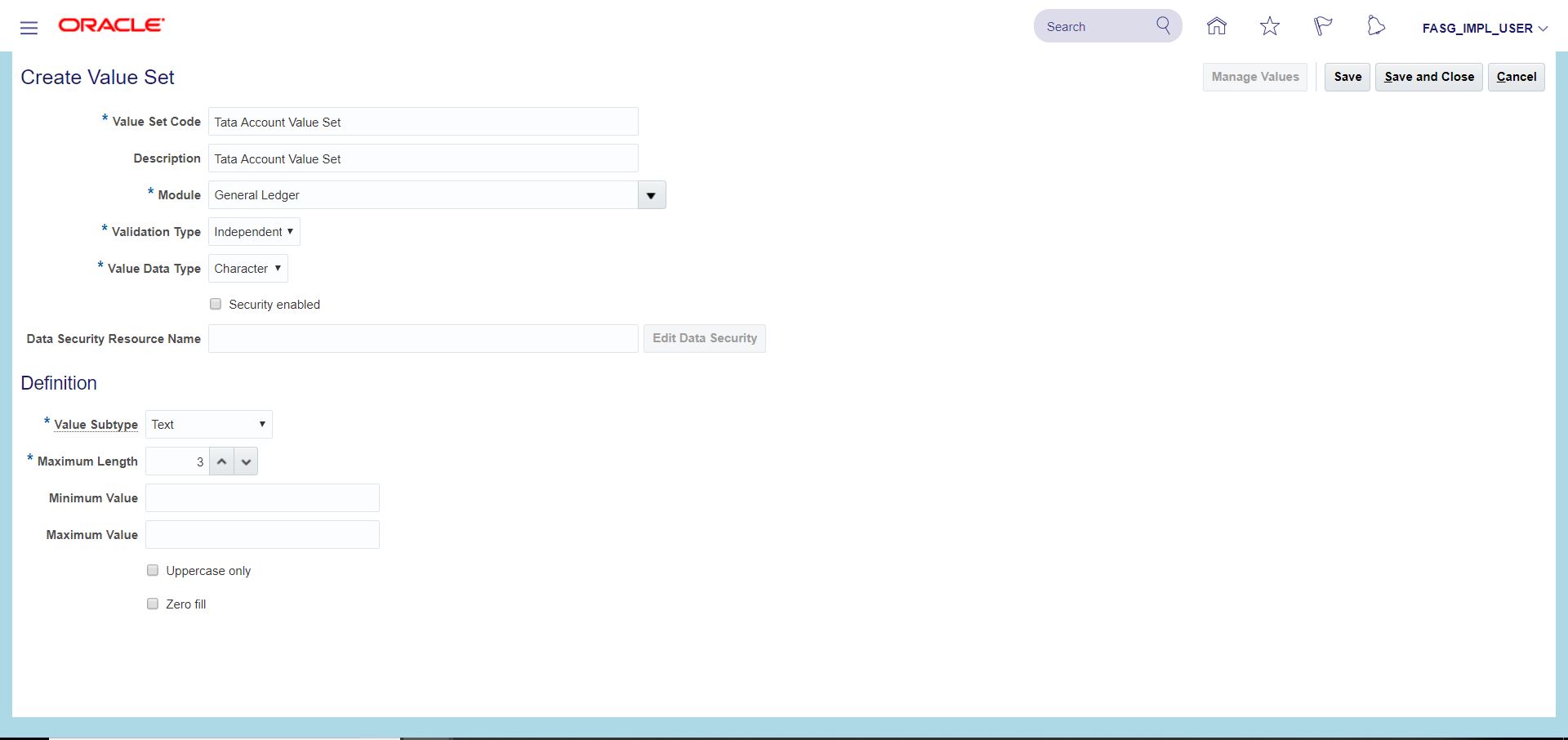 Search for task 'Manage Chart of Accounts Value Set Values' Click on 'Go to Task' >> Click on Create icon (+) >> Search for Value Set Code 'Tata Company Value Set' >> Click on 'Manage Values' >> Click on Create icon (+)