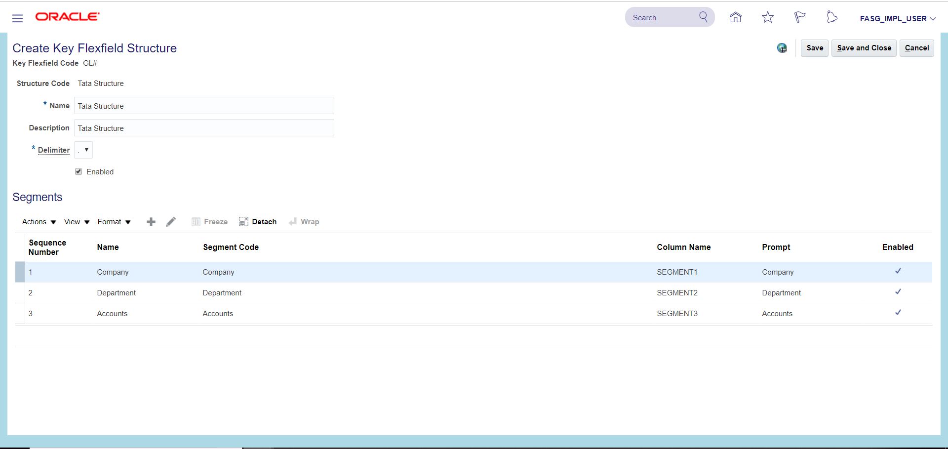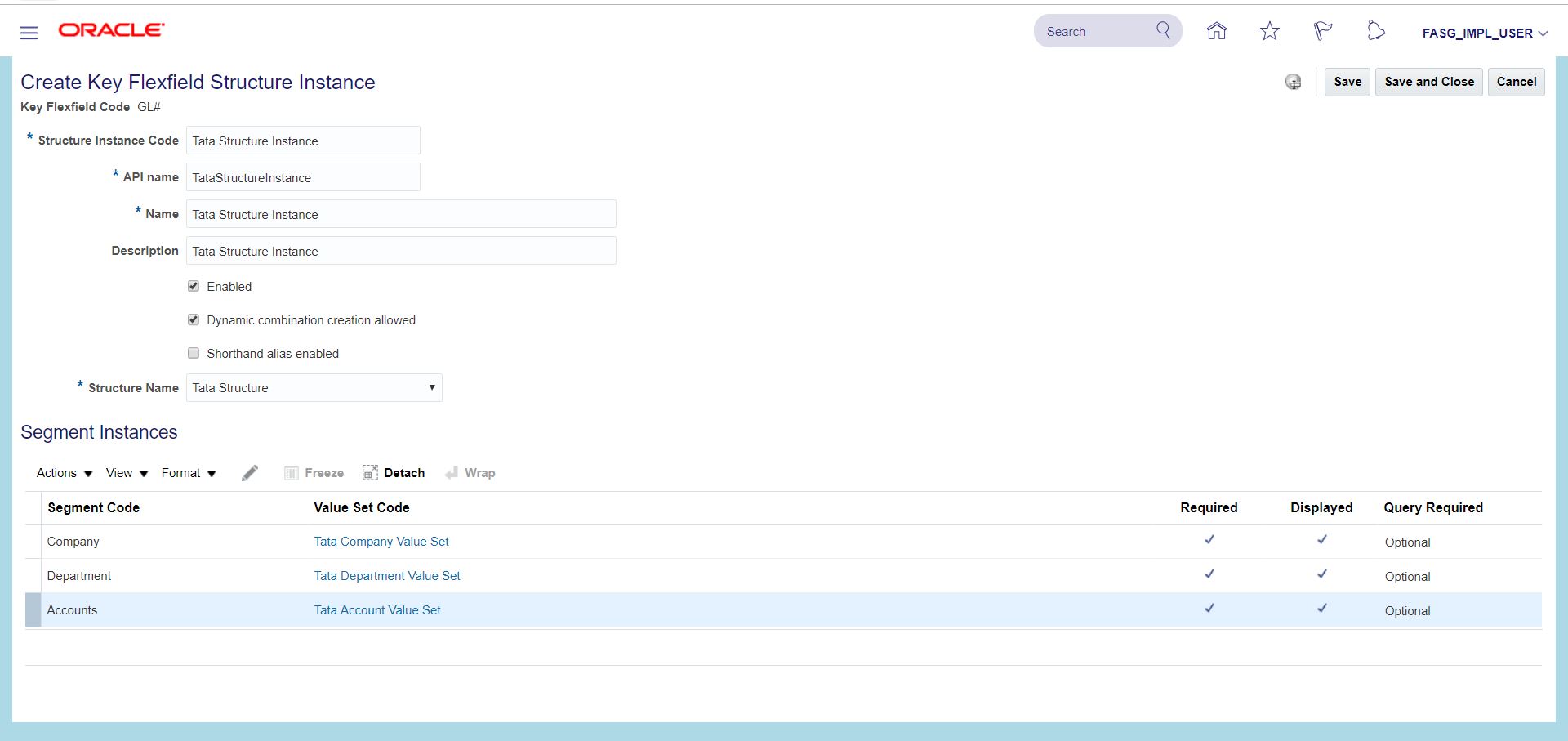 iii) Search for task 'Manage Chart of Accounts Structure Instances' >> Search Key Flexfield Name with 'Accounting Flexfield' >> Go to 'Manage Structures Instances' >> Click on Create icon (+) >> Enter details as below and Save and Close