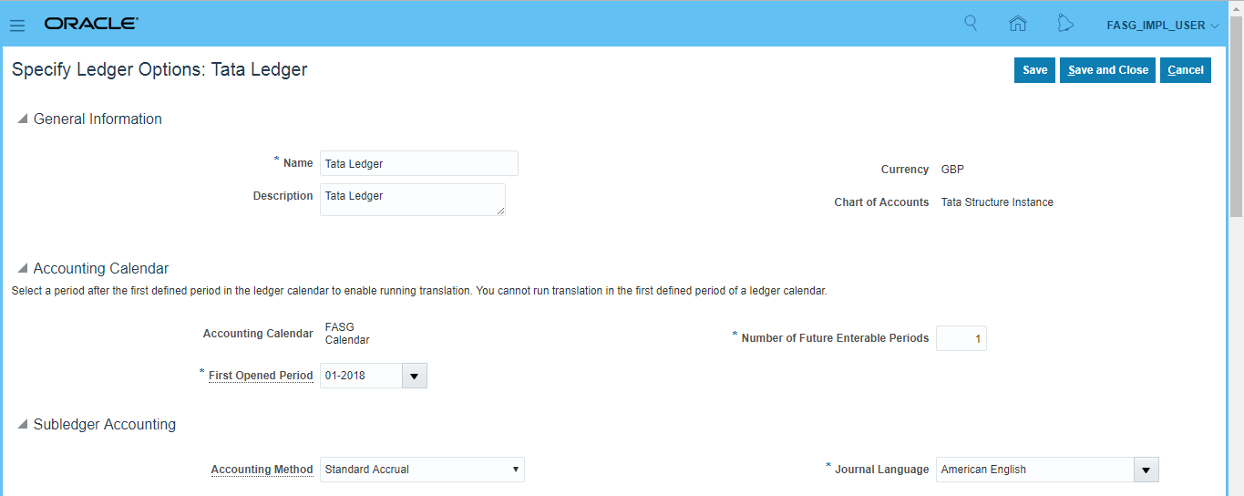 Ledger Creation Search for task 'Manage Primary Ledgers' >> Click 'Go to Task' >> Click on Create icon (+) >> Enter details as below >> Save and Close