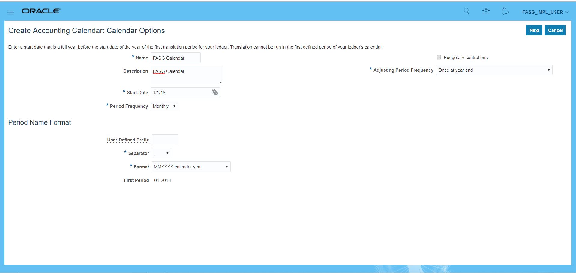 Calendar Navigation: Manage Implementation Projects >> Search for your project {FASG Implementation Project} >> Search for task 'Manage Accounting Calendars' >> Click on 'Go to Task' icon >> We can see all existing calendars >> Click on Create icon