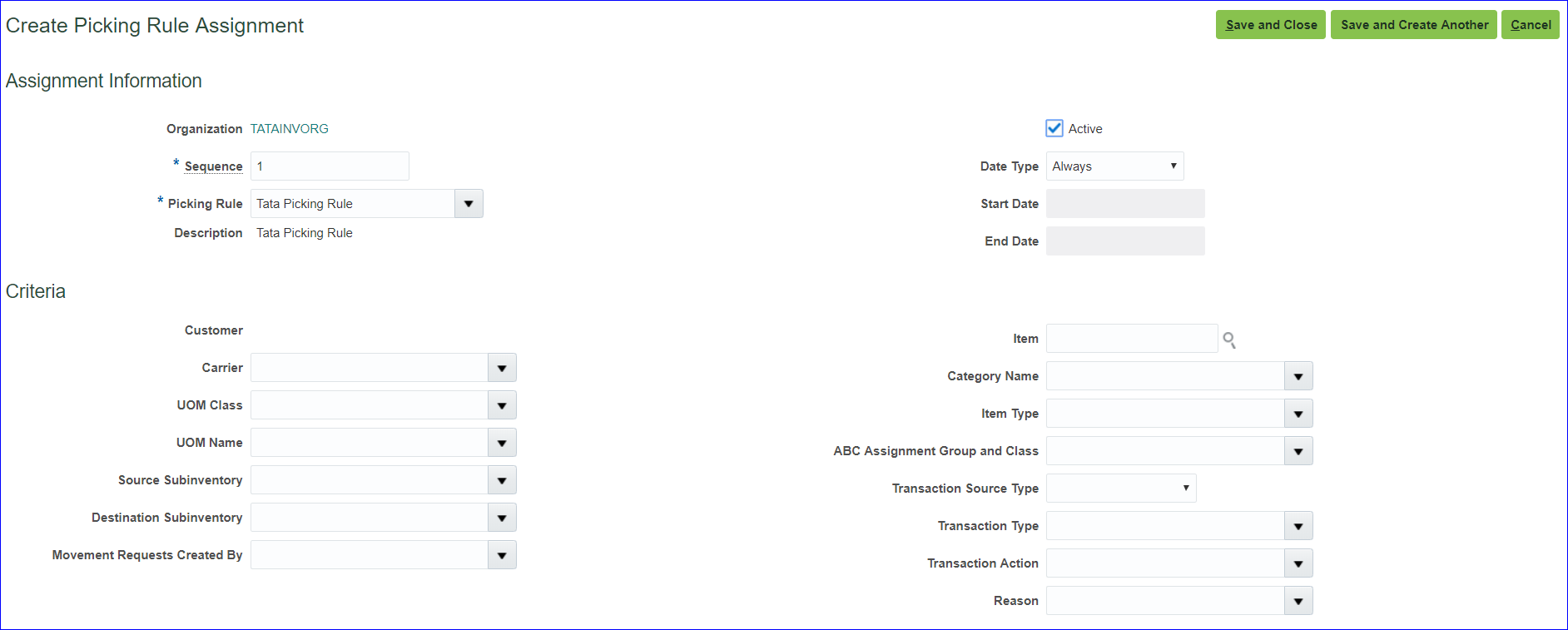 7. Create Picking Rule Assignments Implementation project >> Task 'Manage Picking Rule Assignments' >> Create