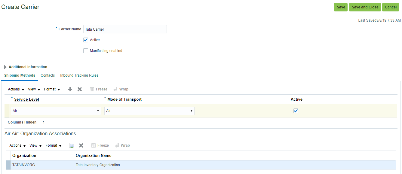 9. Create Staging Subinventory Implementation project >> Task 'Manage Subinventories and Locators' >> Enter Organization (TATAINVORG) >> Create >> Subinventory: Tata StgIn; Description: Tata Staging Subinventory >> Save and Close >> Done