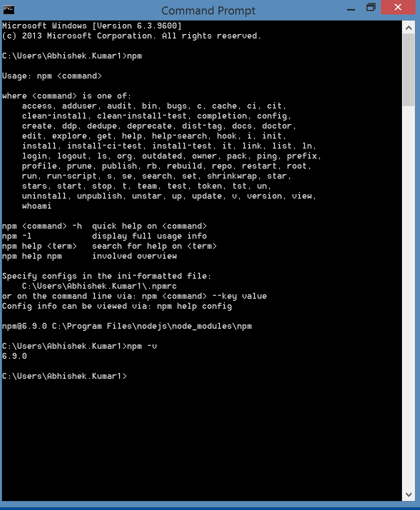 Step 5: Node JS installed together with NPM (Node Package Manager) but NPM will not work automatically, if you will type npm –v you will get that NPM is not defined.
